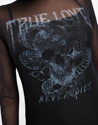 This black mesh long-sleeve midi dress is a stylish and edgy addition to any wardrobe. Designed for women, it features a high neckline and a striking graphic print on the chest, adding a contemporary streetwear vibe. The dress is crafted from a fine, soft, and sheer mesh fabric, composed of 93% polyester and 7% spandex, ensuring a comfortable and stretchy fit. Its regular fit and midi length make it a versatile piece for casual outings or for making a bold statement. The sheer overlay and graphic print contribute to its modern, edgy aesthetic.