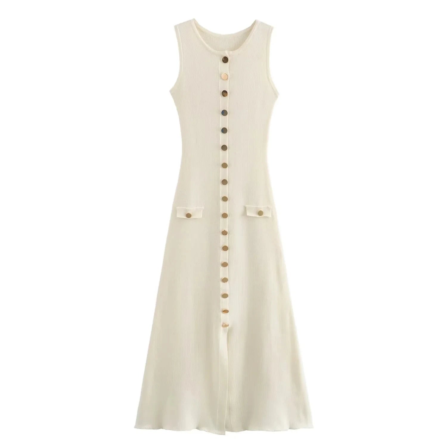 This TRAFZA women's midi dress is designed for the middle-aged office lady. It features a solid, sleeveless O-neck design with a single-breasted closure and functional pockets. The dress is made from a medium-stretch polyester knit fabric, offering a slim fit and a comfortable, casual yet elegant style suitable for summer. Its mid-calf length and straight silhouette make it a versatile piece for office wear or smart casual occasions.