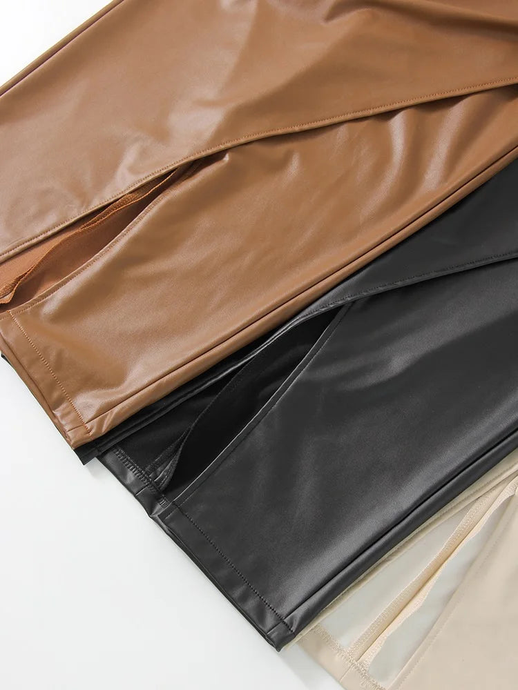 This is a women's midi skirt crafted from faux leather, offering a stylish and modern look. It features a flattering high waist and a slim, A-line silhouette that drapes to a knee-length. The design incorporates elegant ruching details on the front, adding a sophisticated touch, along with a daring front slit for a hint of allure. The material provides slight stretch for comfort, making it suitable for wear across all seasons. This versatile skirt can be easily dressed up or down for various occasions.