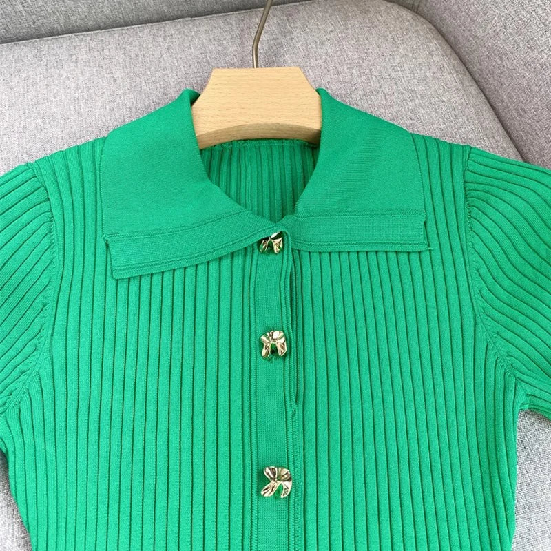 This elegant knit maxi dress is designed for the modern woman, perfect for office wear or summer occasions. It features a flattering bodycon fit on the bodice that transitions into a flowing A-line skirt, creating a sophisticated silhouette. The dress is made from a comfortable knitting cotton blend with medium stretch, ensuring a good fit. Details include a turn-down collar, short sleeves, a single-breasted closure with decorative buttons, and a hollow-out decoration. The ankle-length cut and solid pattern contribute to its chic and versatile style.